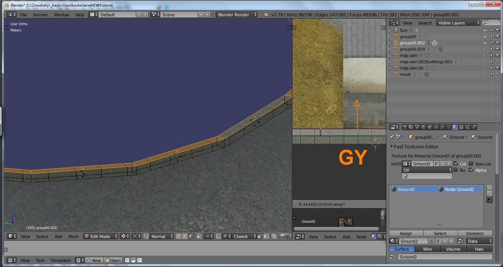 Poslední záležitostí je oprava mapování. Divím se, že to Solidify neumí, dokonce ani jako modifikátor... Naštěstí je to docela jednoduchá operace: v UV editoru vybereme samostatnou hranu (Alt+RC) a upravíme mapování. Z obrázku je myslím zřejmé, že jsem na svislou část obrubníku použil mírně tmavší texturu, než na tu, obrácenou k obloze.